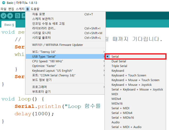 코드를 작성한 뒤에 USB Type으로는 [Serial]을 선택합니다.