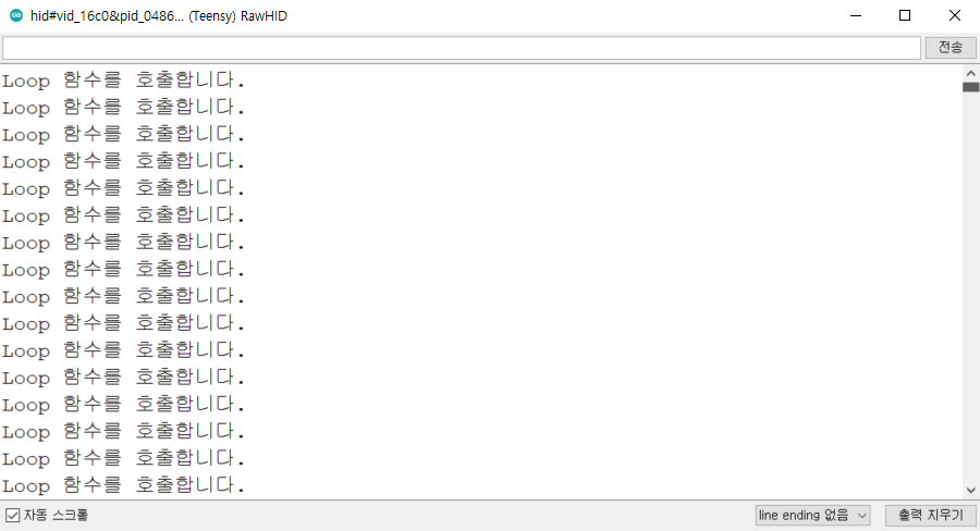 예를 들어 이와 같이 USB Type을 Raw HID로 설정하여 동일한 코드를 실행하면 다음과 같이 setup() 함수에 정의되어 있던 출력 구문은 출력되지 않는 것을 알 수 있습니다.