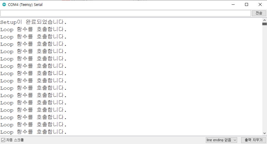 업로드를 해보시면 1초에 한 번씩 Serial 통신이 수행되어 문자열이 출력됩니다.