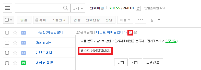 그럼 [받은 메일함]에서 돋보기 버튼을 눌러서 받은 메일의 내용을 미리보기 할 수 있습니다.
