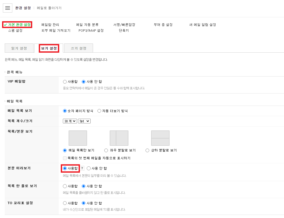 환경 설정 탭에서는 [기본 환경 설정] - [보기 설정] - [본문 미리보기]에 "사용함"을 체크하시면 됩니다.