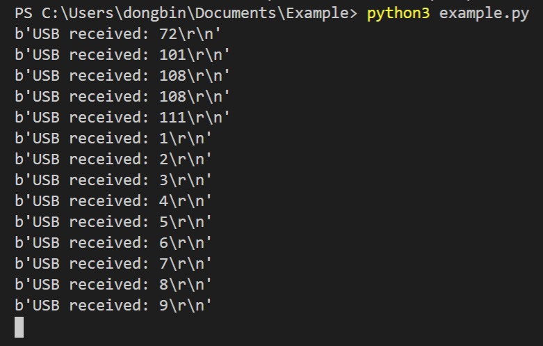 호스트(Host) 쪽에서 데이터를 보낼 때 별도의 프로그램을 이용할 수도 있습니다. 프로그램은 다음과 같이 작성할 수 있습니다. 프로그래밍 언어는 Python 3.7이며 serial 라이브러리를 이용하면 됩니다.