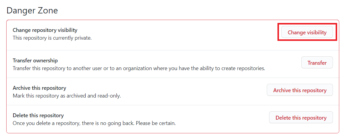[Settings] 탭에서 아래로 쭉 내려 보시면 다음과 같이 [Danger Zone]에 [Change Visibility] 버튼이 있습니다. 이를 클릭해서 해당 저장소가 외부에 보일지 안 보일지를 설정할 수 있습니다.