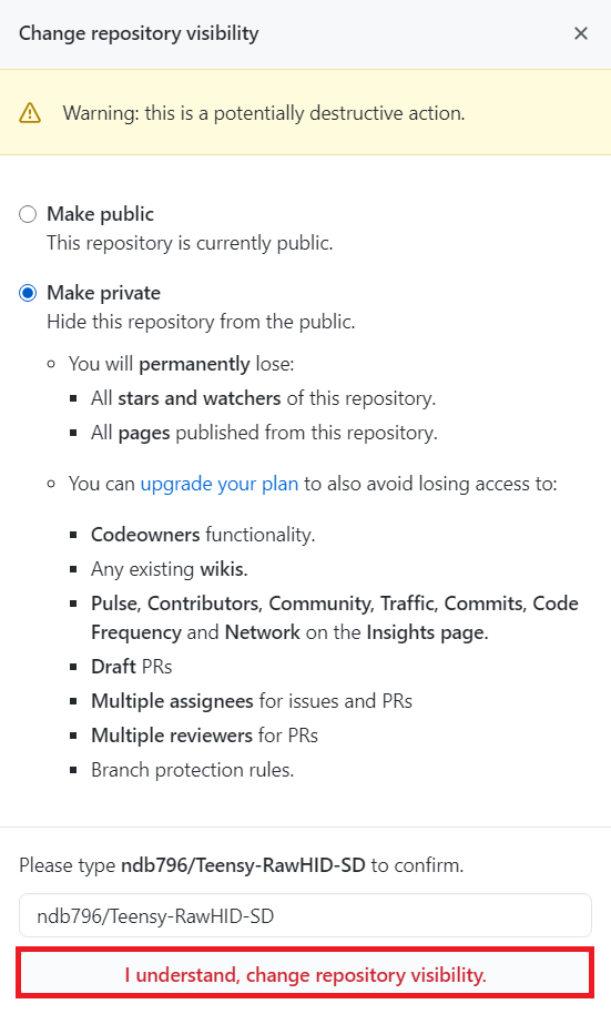 이제 여기에서 현재 저장소의 설정에 따라서 Public ↔ Private 서로 변경이 가능합니다. 예를 들어 Public 상태에서 Private으로 변경하는 경우에는 다음과 같이 설정할 수 있습니다. 참고로 Public 상태에서 Private으로 바꾸게 되면, 당연히 현재 저장소에 달려 있던 별점(Star)을 포함해 각종 정보가 사라지게 됩니다.