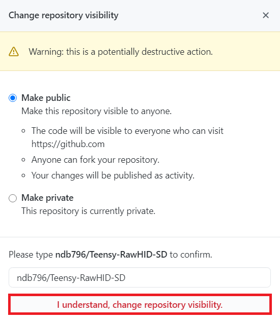 참고로 Private 상태에서 Public 상태로 바꿀 때에는 당연히 저장소의 모든 코드가 외부로 공개되며, 누구나 자신의 코드에 접근하여 포크(Fork)를 진행할 수 있다는 점을 감안해야 합니다. 나중에 다시 Private으로 바꾼다고 하더라도 일단 다른 사람이 제 코드를 이미 모두 가지고 있을 수도 있다고 보아야 하는 겁니다.