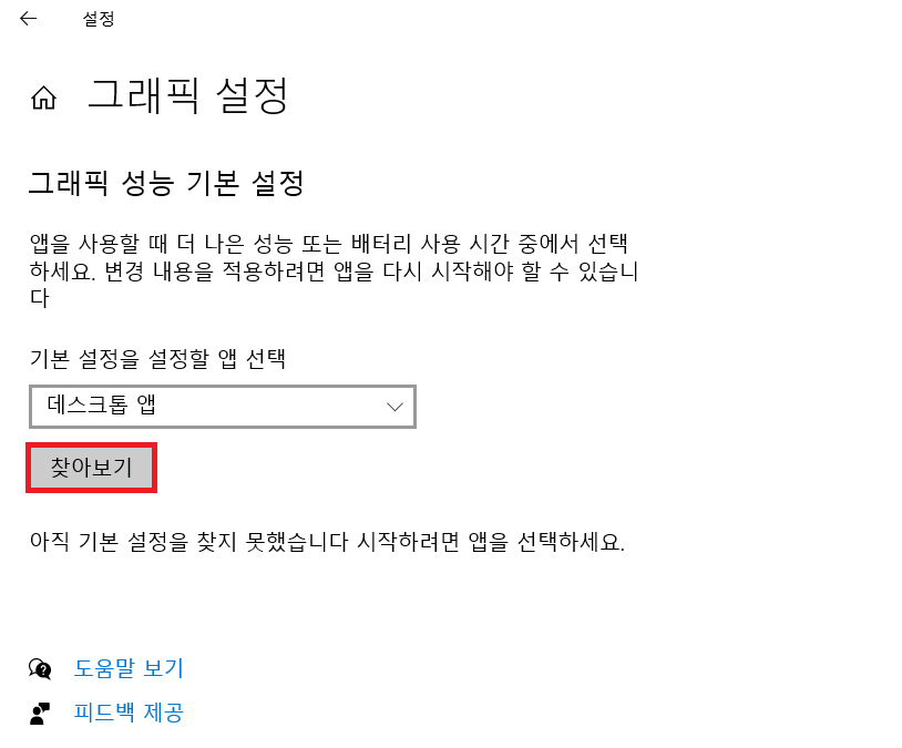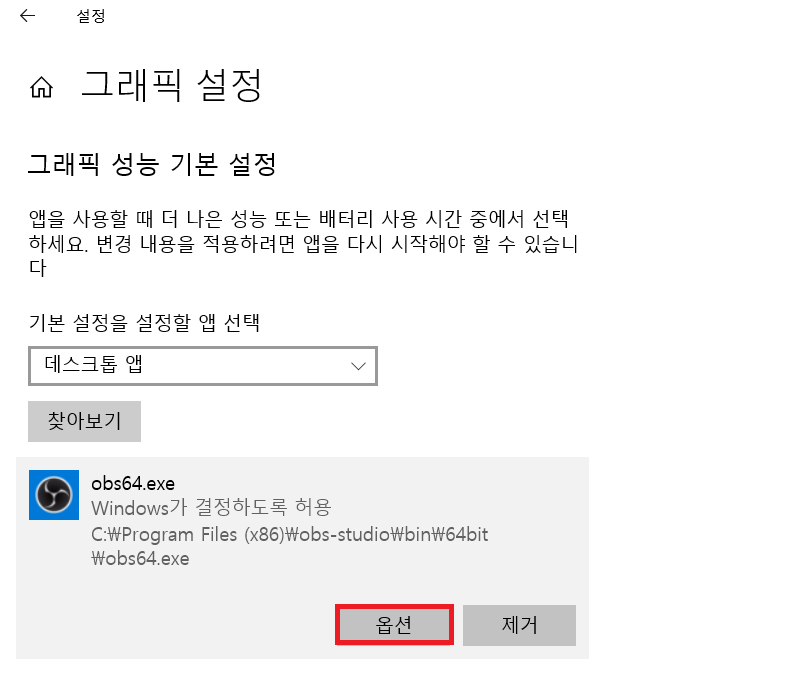 이후에 그래픽 설정 탭에서 [찾아보기] 버튼을 누르고 설정을 하기 위한 OBS 앱을 찾습니다.