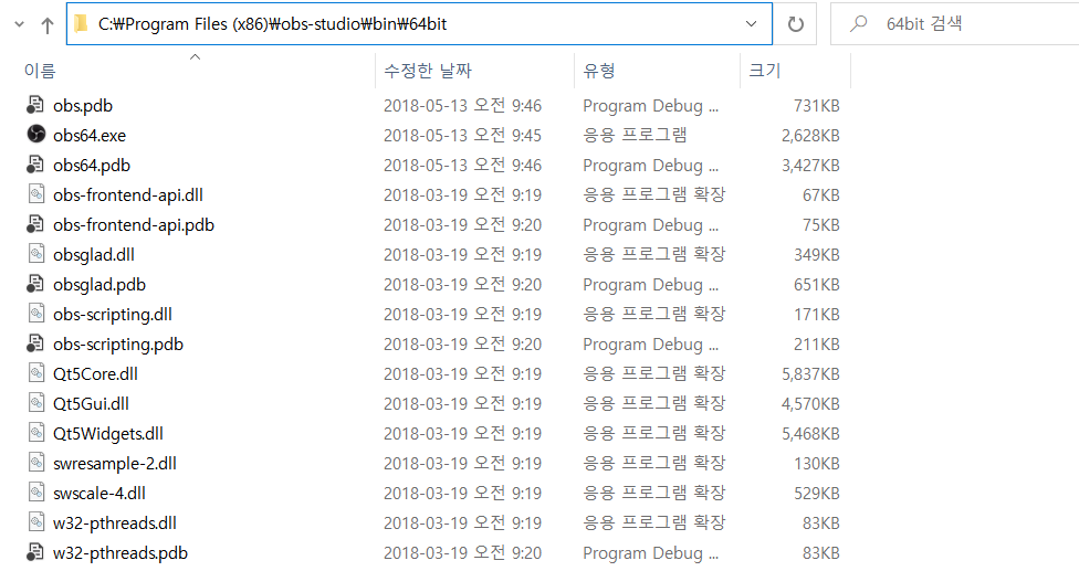 일반적으로 이 문제는 그래픽 카드 설정 때문에 발생합니다. 기본적으로 NVIDIA 제어판에서 OBS를 NVIDIA 그래픽이 아닌 통합 그래픽 카드를 이용하도록 하면 문제가 해결되는 경우가 많습니다. 따라서 먼저 OBS가 설치된 경로를 확인해야 합니다. 제가 설치한 OBS는 obs64.exe라는 실행 파일 형태로 존재합니다.