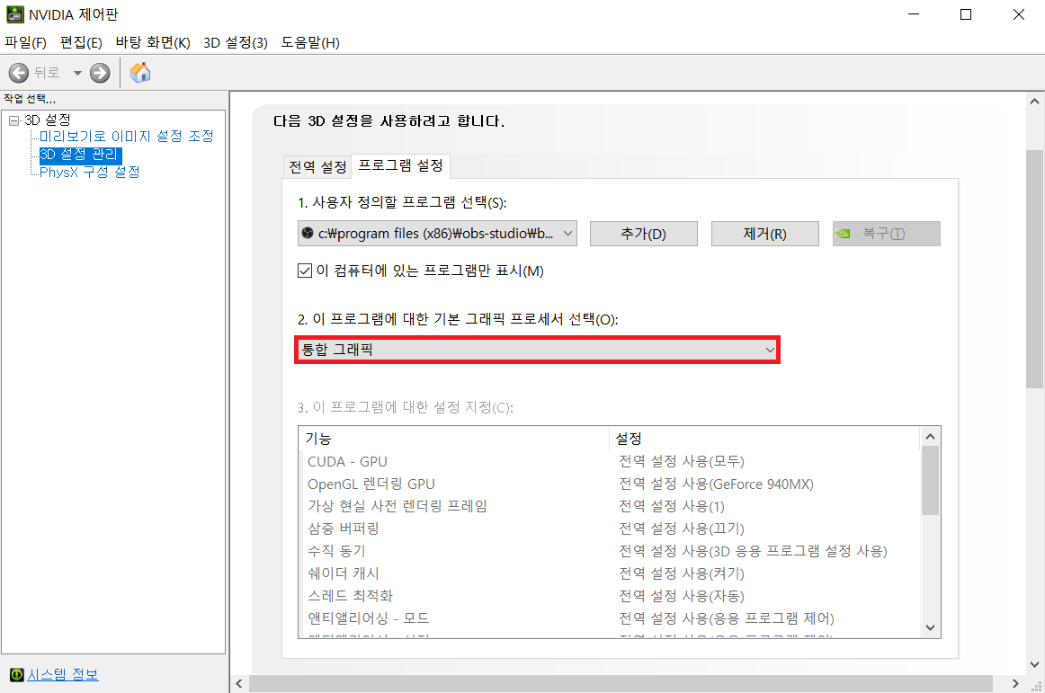 NVIDIA에서 OBS 프로그램의 기본 그래픽 프로세서를 [통합 그래픽]으로 설정하면 됩니다. (만약에 프로그램이 보이지 않는다면 아까전에 확인한 OBS가 설치된 경로에서 실행 파일을 선택하여 추가하면 됩니다.)