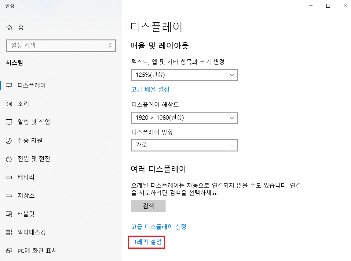 위와 같이 NVIDIA 제어판에서 OBS를 [통합 그래픽]으로 설정을 해주었음에도 불구하고 여전히 해결이 되지 않았다면 [디스플레이 설정]에 들어가서 [그래픽 설정] 탭으로 이동합니다.
