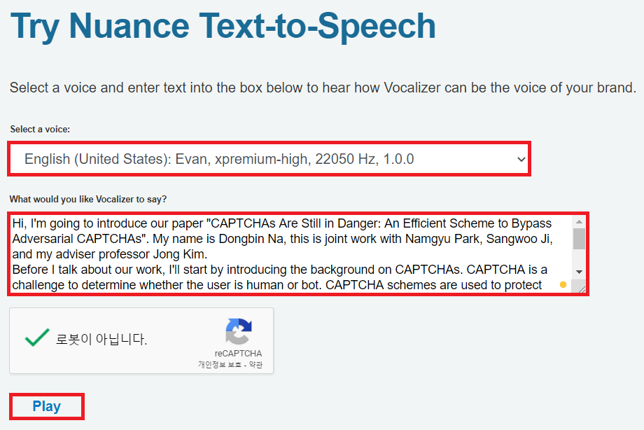 Nuance의 TTS 서비스 또한 인터넷에 접속하여 바로 데모를 실행해 볼 수 있습니다. 마찬가지로 이 사이트도 데모를 실행할 때의 글자 길이 제한이 넉넉한 편이라서 많이 테스트를 해볼 수 있습니다. 다시 말해 데모인데도 불구하고 많은 텍스트를 넣을 수 있기 때문에 사실상 무료처럼 느끼고 사용하고 있습니다. TTS 성능은 다른 서비스에 비해서 준수한 편입니다. 다음과 같이 성우를 선택한 뒤에, 텍스트를 입력하고 [Play] 버튼을 누르시면 됩니다.