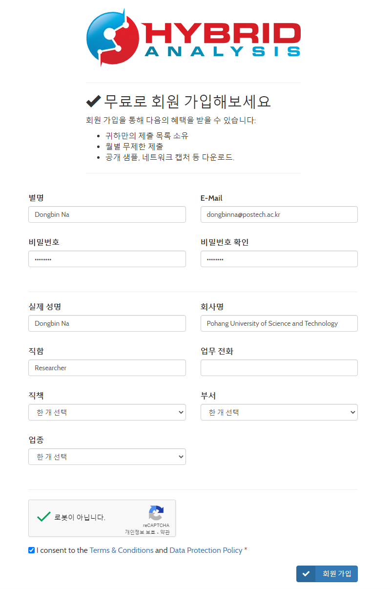 참고로 해당 사이트를 제대로 이용하기 위해서는 회원가입을 진행해야 합니다. 특히 공개된 악성 코드를 다운로드 하기 위해서는 회원가입 과정이 필수입니다. 만약 아무나 악성 코드를 쉽게 다운로드 할 수 있다면, 악용하는 경우도 많을 것입니다. 본 사이트는 그러한 악용 사례를 미연에 방지하기 위하여 회원가입 및 인증(심사) 제도를 채택하고 있습니다.