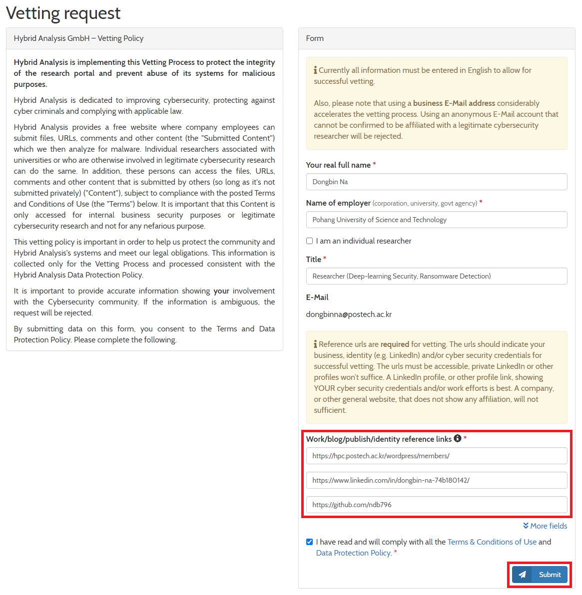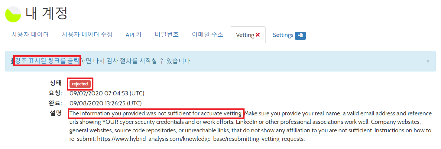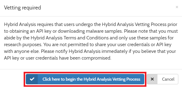 다만 다운로드를 진행하기에 앞서 심사(Vetting) 과정이 필요합니다. Hybrid Analysis는 철저히 연구 목적으로 악성 코드 파일을 공유하는 서비스이므로, 악의적인 목적으로 서비스가 악용되지 않아야 할 것입니다. 따라서 웹 사이트 단에서 기본적인 심사 과정을 거치고 있습니다.