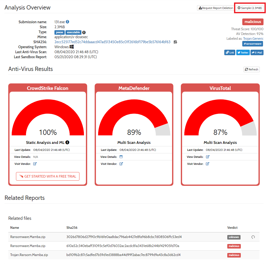 검색 이후에 실제로 하나의 악성 코드를 클릭해 보시면 다음과 같이 분석 결과가 나옵니다. 오른쪽에는 [Sample] 다운로드 버튼이 있는데요. 이걸 클릭해서 다운로드 하실 수 있습니다.