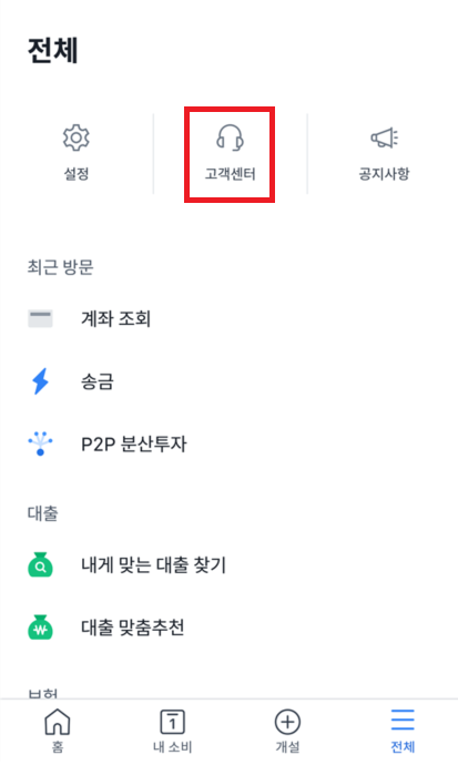 가장 먼저 바로 앱에서 [고객센터] 탭으로 이동합니다.