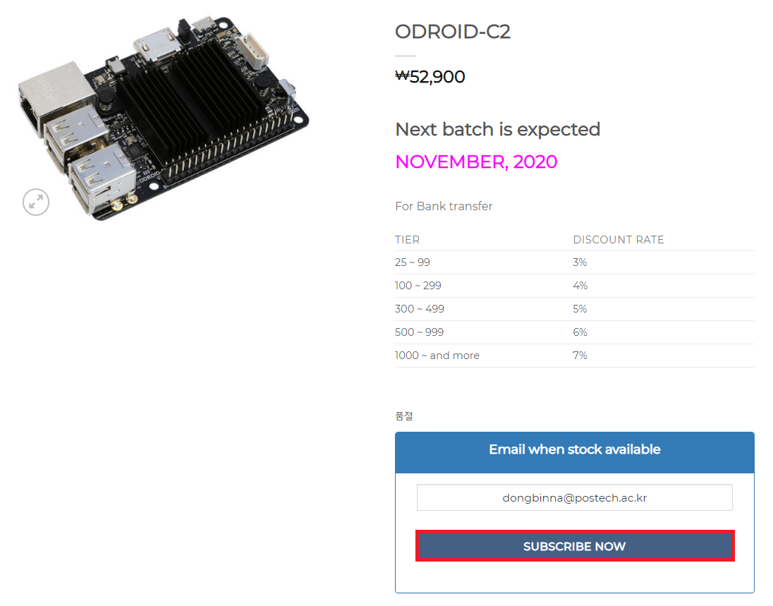 참고로 ODROID-C2는 잘 팔리는 제품이라서 품절이 발생할 수 있습니다. 만약 품절이라면 입고 알림 메시지를 받도록 할 수 있습니다.