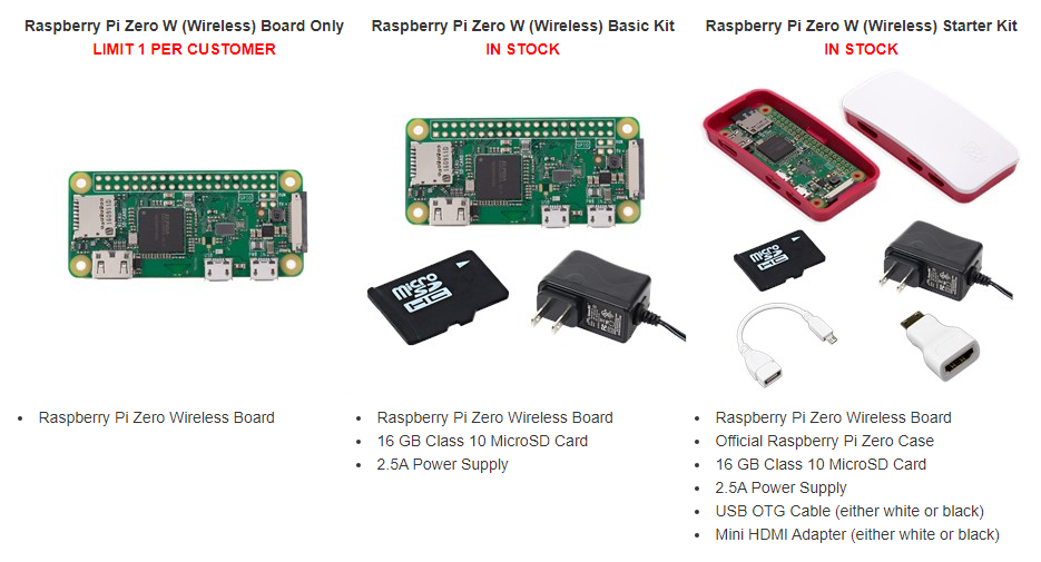 상세한 물품 구성은 다음과 같습니다. Raspberry Pi Zero W 단품만 구매하는 경우에는 사람당 1개씩으로 개수를 한정하는 것 같습니다. 온전한 하나의 미니 컴퓨터 형태를 원한다면 Start Kit을 이용하시면 됩니다.