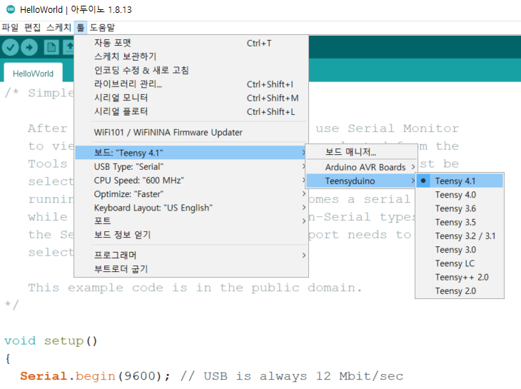 그리고 Teensy의 가장 큰 특징은 아두이노(Arduino) 개발 환경을 그대로 이용할 수 있다는 점입니다. Teensy 공식 홈페이지에서 제공하는 Teensyduino를 설치하면 다음과 같이 아두이노 개발 환경에서 사용 가능한 보드로 Teensy가 보이게 됩니다. 이 경우 아두이노 개발 환경을 이용하되 코어 라이브러리의 코드는 Teensy 전용 코드로 이용할 수 있습니다.