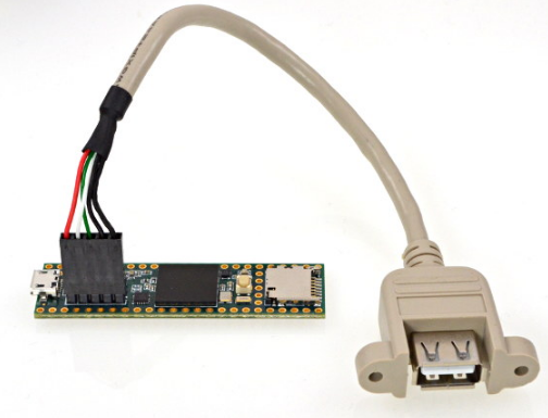참고로 Teensy 4.1은 USB 호스트 포트 또한 지원합니다. 다시 말해 Teensy를 호스트 PC처럼 사용할 수 있습니니다. 예를 들어 Teensy와 키보드를 서로 연결하여 키보드에 입력한 정보가 Teensy에 임시적으로 기록되었다가, Teensy에서 다시 실제 호스트(Host) PC로 데이터를 넘겨 주는 것도 가능할 것입니다. 이를 위해서는 별도로 USB 호스트 케이블이 필요하다고 하네요. 다음과 같은 케이블을 산 뒤에 Teensy 4.1의 5핀에 꽂아서 사용할 수 있습니다. 실제로 USB 호스트 포트를 이용하는 경우는 다음의 그림과 같습니다.