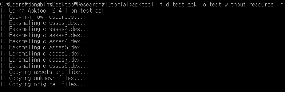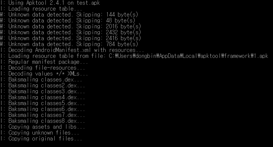 필자의 경우 Apktool v.2.4.1을 이용하였으며, 재빌드 과정에서 --use-aapt2 옵션을 넣어주었다. 일단 먼저 디컴파일을 하면 다음과 같이 실행될 것이다. 정상적으로 디컴파일이 완료된 것을 확인할 수 있다.