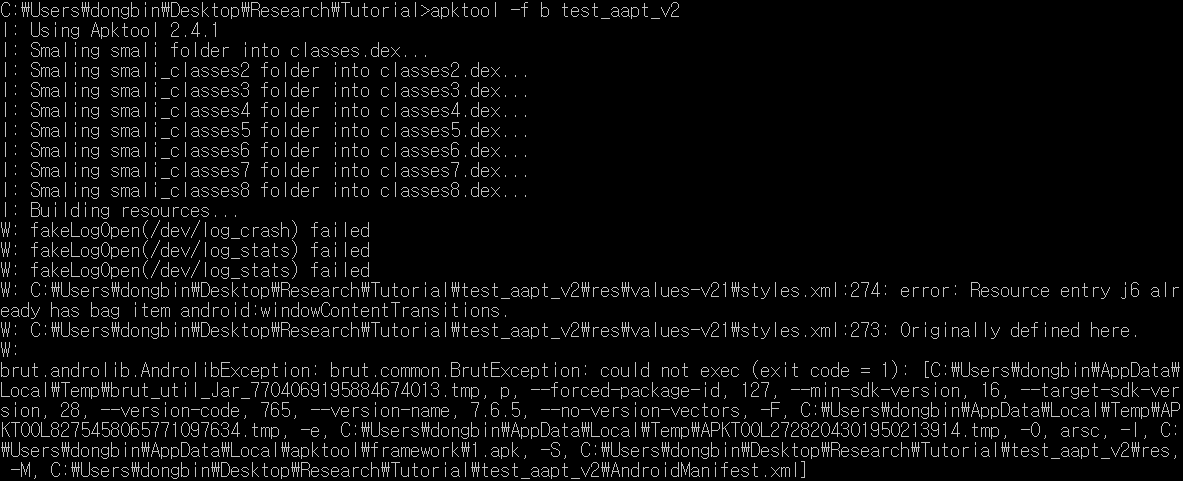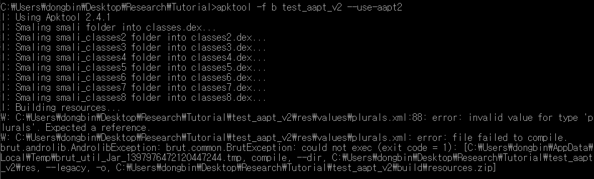 [Apktool 오류] brut.androlib.AndrolibException: brut.common.BrutException: could not exec (exit code = 1)