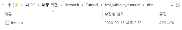 필자는 앱을 분석할 때 리소스를 직접 추가하여 앱을 확장할 목적이 없고, 단순히 smali 코드 수정 및 분석이 주 목적이어서 이러한 방법을 이용해도 문제가 없는 상황이다. 결과적으로 다음과 같이 dist 폴더 안에 APK 파일이 생성된다.