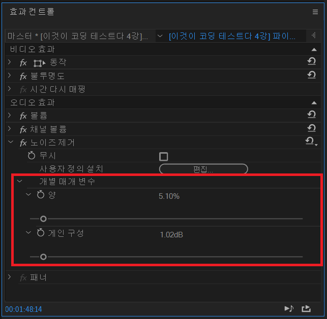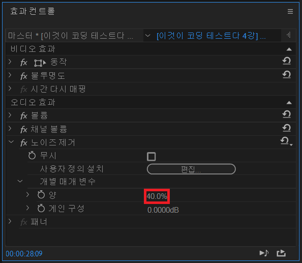 다음과 같이 기본적인 설정으로 40%가 적용되어 있습니다. 사실 이 수치는 일반적인 영상에서 아주 큰 수치라서 목소리도 많이 제거될 수 있다. 그래서 필자의 경우 일반적으로 5~10% 정도로 설정한다.