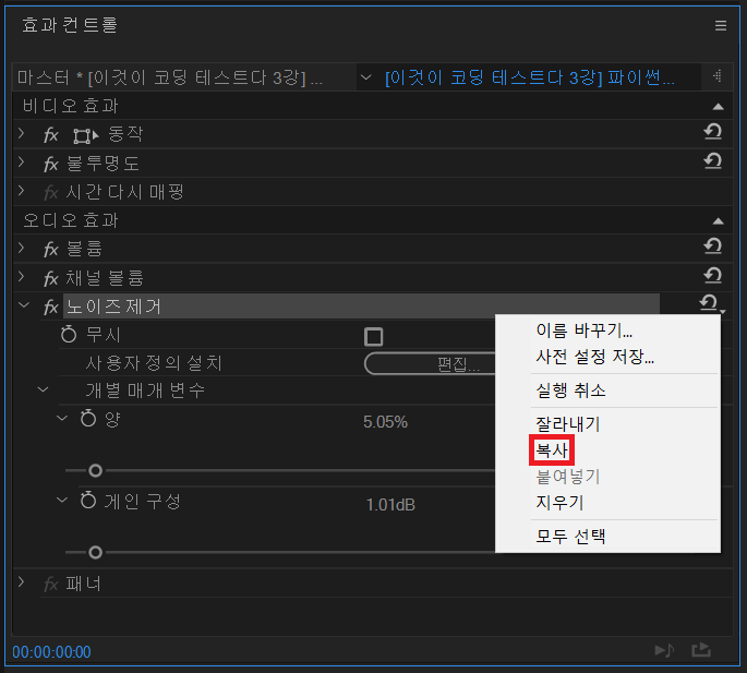 어도비 프리미어(Premiere)에서 효과를 복사해 한꺼번에 여러 시퀀스(Sequence)에 붙여넣고 싶을 때가 있다. 하나의 시퀀스에 적용된 특정한 효과를 복사할 때는 그냥 우클릭해서 [복사] 버튼을 누르면 된다.