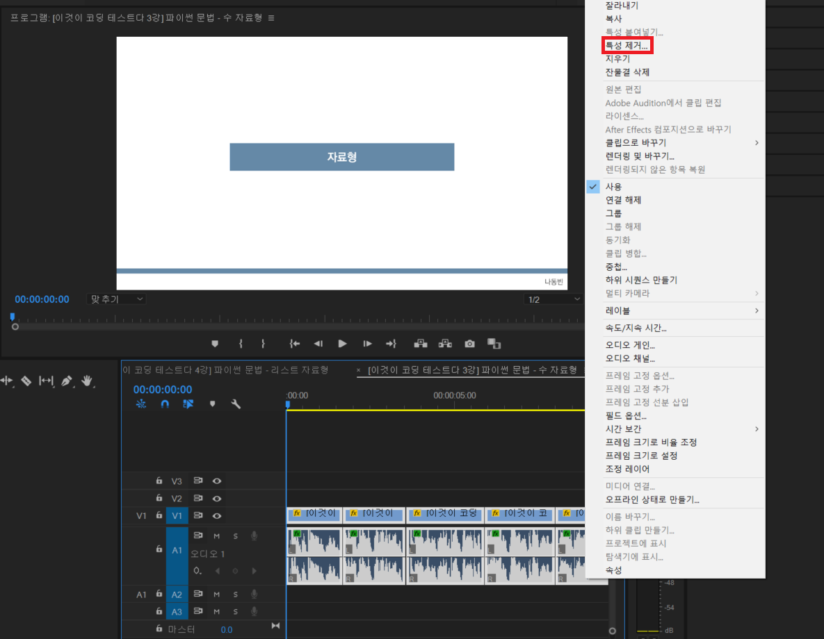 만약에 여러 시퀀스에 적용된 효과(Effect)를 한꺼번에 제거하고 싶을 때는 시퀀스를 선택한 뒤에 [특성 제거] 버튼을 눌러서 원하는 특성을 제거할 수 있다.