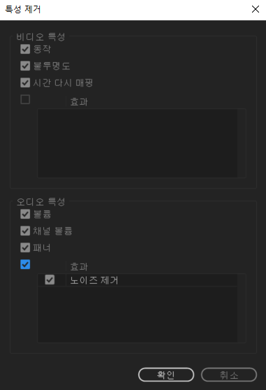 [특성 제거] 탭에서는 제거하고자 하는 특성에 체크하면 된다. 그러면 체크된 효과는 모두 제거된다. 만약 노이즈 제거 효과를 제거하고 싶다면, 다음과 같이 [노이즈 제거]에 체크하여 [확인] 버튼을 누르자.
