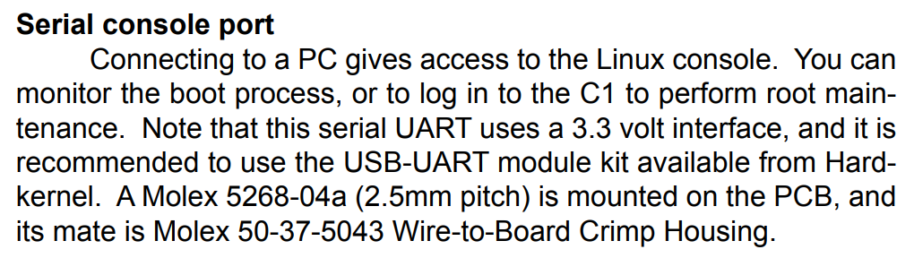 실제로 시리얼 콘솔(Serial Console)을 이용하는 방법을 확인해 보자. ODROID C1 사용자 매뉴얼에 따르면 USB-UART 모듈 키트가 필요하다고 한다. 관련 문단을 가져오면 다음과 같다.