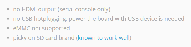 이것을 그대로 다운로드 받아서 SD 카드에 설치하면 되는 것 같다. 다만 한 가지 문제가 있다. Armbian 사이트에 따르면 이 이미지를 설치해도 HDMI 출력을 지원하지 않는다고 한다. 즉 OS를 설치한 뒤에 부팅을 해도 화면이 안 나온다는 의미다. 아래 설명을 보면 시리얼 콘솔(serial console)만 지원한다고 한다.