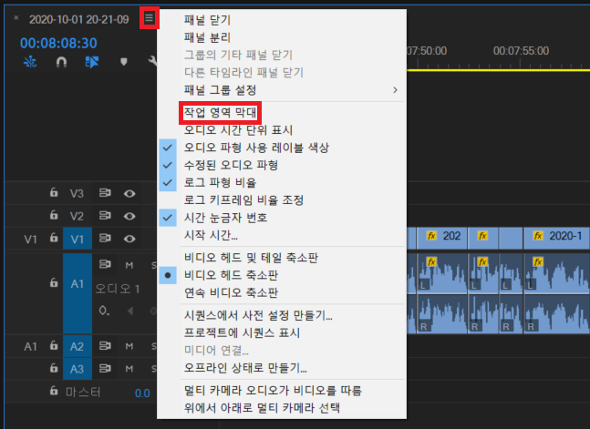 어도비 프리미어(Premiere)에서 특정 시간 범위만 동영상으로 내보내는 방법은 간단하다. 가장 먼저 메뉴 아이콘을 클릭해서 [작업 영역 막대]를 누르자.