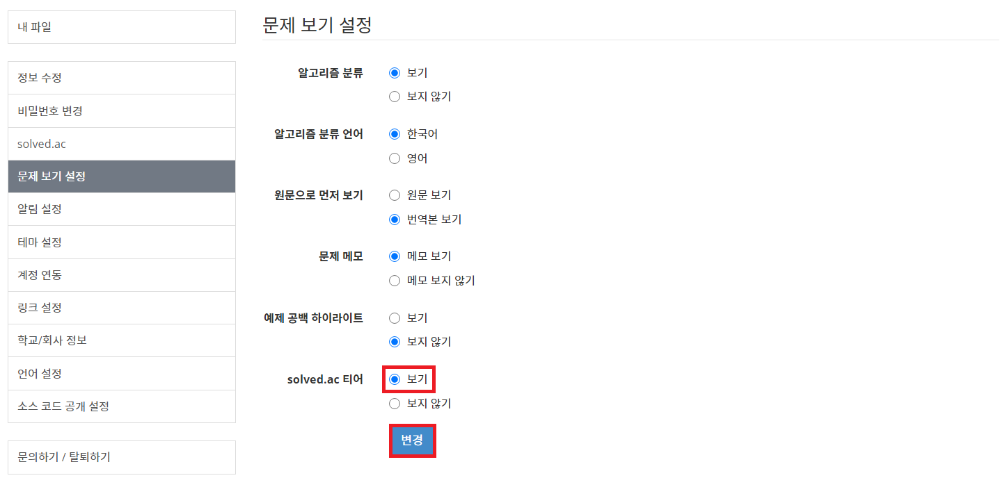 이어서 [문제 보기 설정] 탭으로 이동하여 solved.ac 티어란에서 [보기]를 체크하면 됩니다.