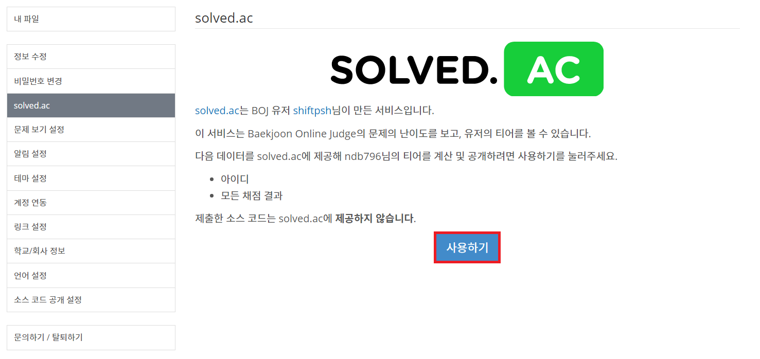 이후에 [solved.ac] 탭에서 [사용하기] 버튼을 눌러서 백준 온라인 저지에서 문제에 대한 난이도를 바로 확인 가능합니다.