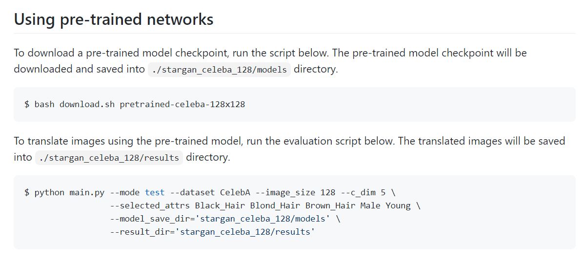 흔히 깃허브(GitHub)에 올라와 있는 다양한 프로젝트에서는 별도의 main.py 소스코드를 정의한 뒤에 인자(argument)를 넘겨 주어서 프로그램을 실행하는 방식을 많이 사용합니다. 이것이 가장 전통적인 방법이기도 하며, 실제로 코드를 이용하는 사람 입장에서는 소스코드를 다운로드 한 뒤에 인자 값과 함께 코드를 실행해야 합니다. 예를 들어 StarGAN의 공식 GitHub에 적혀 있는 내용을 가져오면 다음과 같습니다.