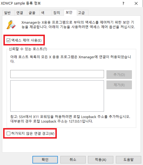 이후에 [보안] 탭에서 [허가되지 않은 연결 경고(W)]를 체크 해제하자. 그러면 신뢰할 수 있는 호스트가 아니라면 접근 제어가 작동하는 모든 X 응용프로그램의 접속은 거부된다.