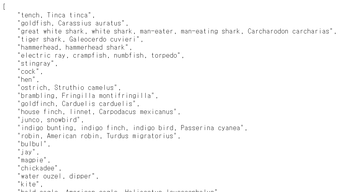 전체 레이블(label) 이름을 확인하고 싶다면 다음과 같이 이미지넷(ImageNet) 클래스 정보가 기록되어 있는 JSON 파일을 확인하면 된다. 이 경로에서 전체 레이블 정보를 확인할 수 있다. 실제로 파이썬 프로그램상으로도 이 경로에서 JSON 파일을 받아와 사용하는 식으로 사용하곤 한다.