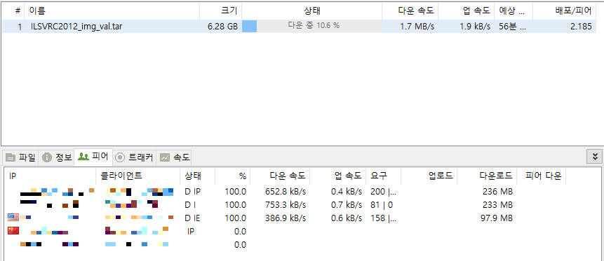 실제로 필자는 adversarial attack 관련 연구를 진행하고 있어서 검증(validation) 데이터셋만 있으면 되는 상황이다. 이럴 때는 ILSVRC 2012 Validation Set을 다운로드받으면 된다. 실제로 토렌트를 이용해 받으면 대략 1MB/s ~ 8MB/s 사이의 속도로 다운로드가 진행된다. 데이터셋의 용량이 크기 때문에 넉넉히 기다리는 것이 좋다.