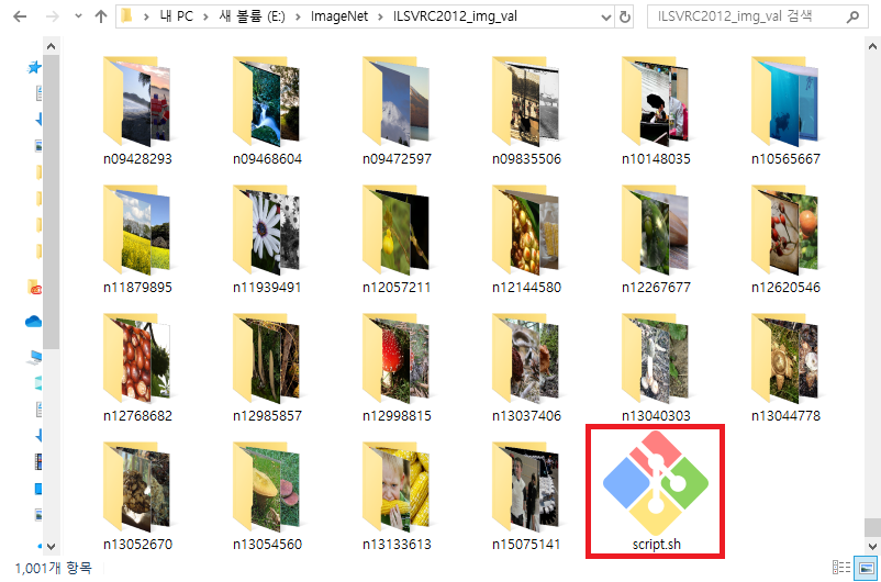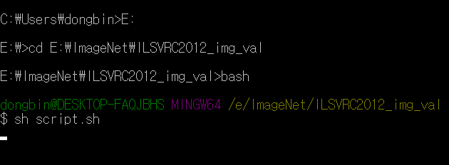 이미 다른 사람이 검증(validation)용 데이터를 정리하는 방법을 제안하고 있다. 이 경로에서 쉘 스크립트를 다운로드하자. 쉘 스크립트(.sh)를 실행하면 모든 이미지를 폴더별로 정리한다. 가장 먼저 압축 해제한 폴더에 스크립트 파일이 저장될 수 있도록 하자. 필자의 경우 script.sh 라는 이름으로 스크립트 파일을 만들었다. 참고로 윈도우(Windows) OS에서 쉘 스크립트를 실행하려면 bash 모드로 들어간 뒤에 리눅스 명령을 입력하면 된다. 다음과 같이 스크립트를 실행하자. 스크립트를 실행하면 모든 이미지가 처리될 때까지 최대 2시간까지의 시간이 소요될 수 있다.