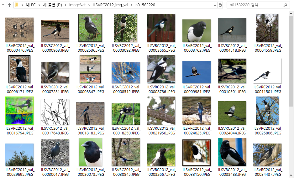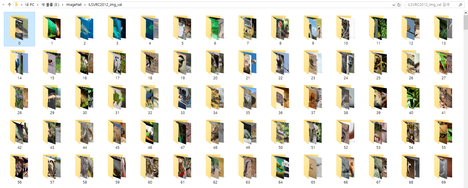 쉘 스크립트가 완전히 실행된 뒤에는 다음과 같이 50,000개의 검증용 데이터셋이 총 1,000개의 클래스(폴더)에 분리되어 저장된다. 폴더 번호가 낮은 것부터 차례대로 인덱스가 부여되는 것이다. 다만 폴더의 이름이 약간 어색하게 느껴질 수 있다. 폴더명에 따른 실제 클래스 이름은 다음의 경로에 기록되어 있다. 실제로 이 JSON 파일을 이용하여 구분할 수 있다. 예를 들어 19번째 폴더인 n01582220 폴더는 까치(magpie)를 의미한다.