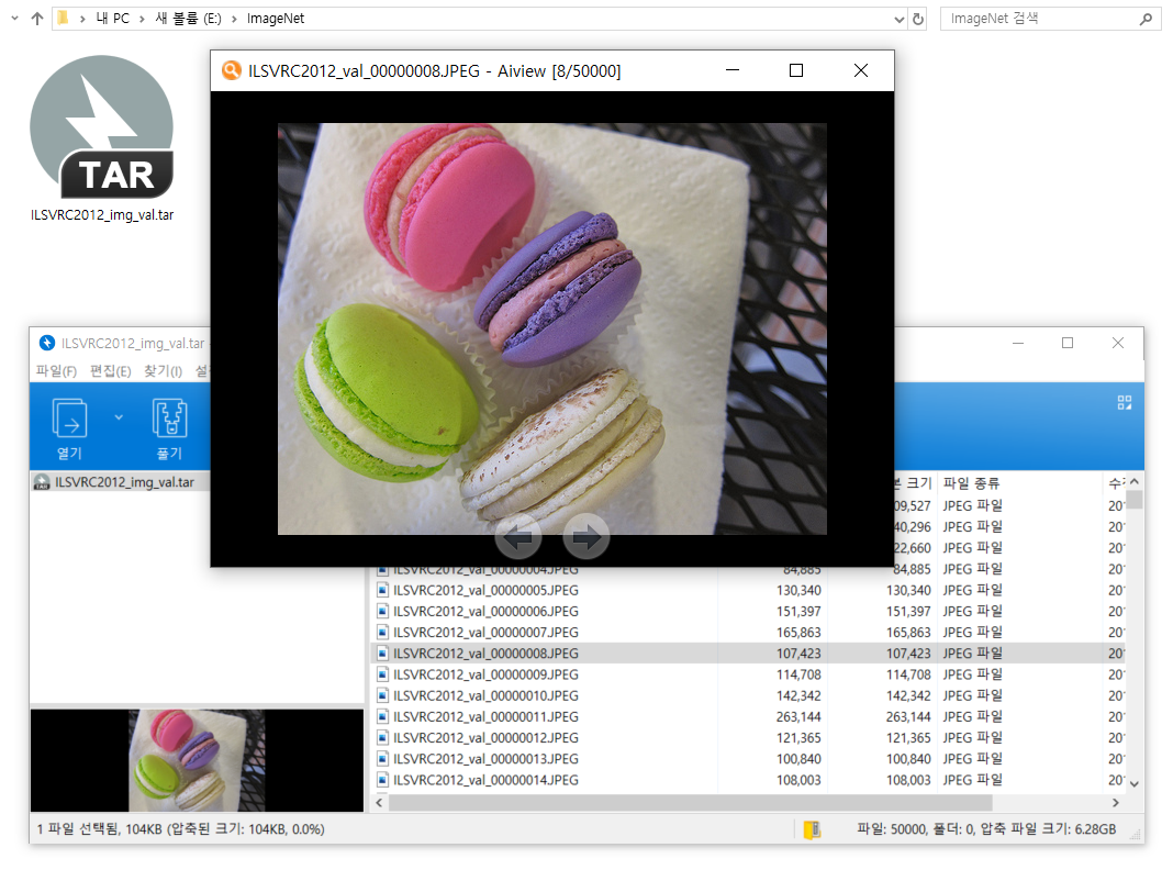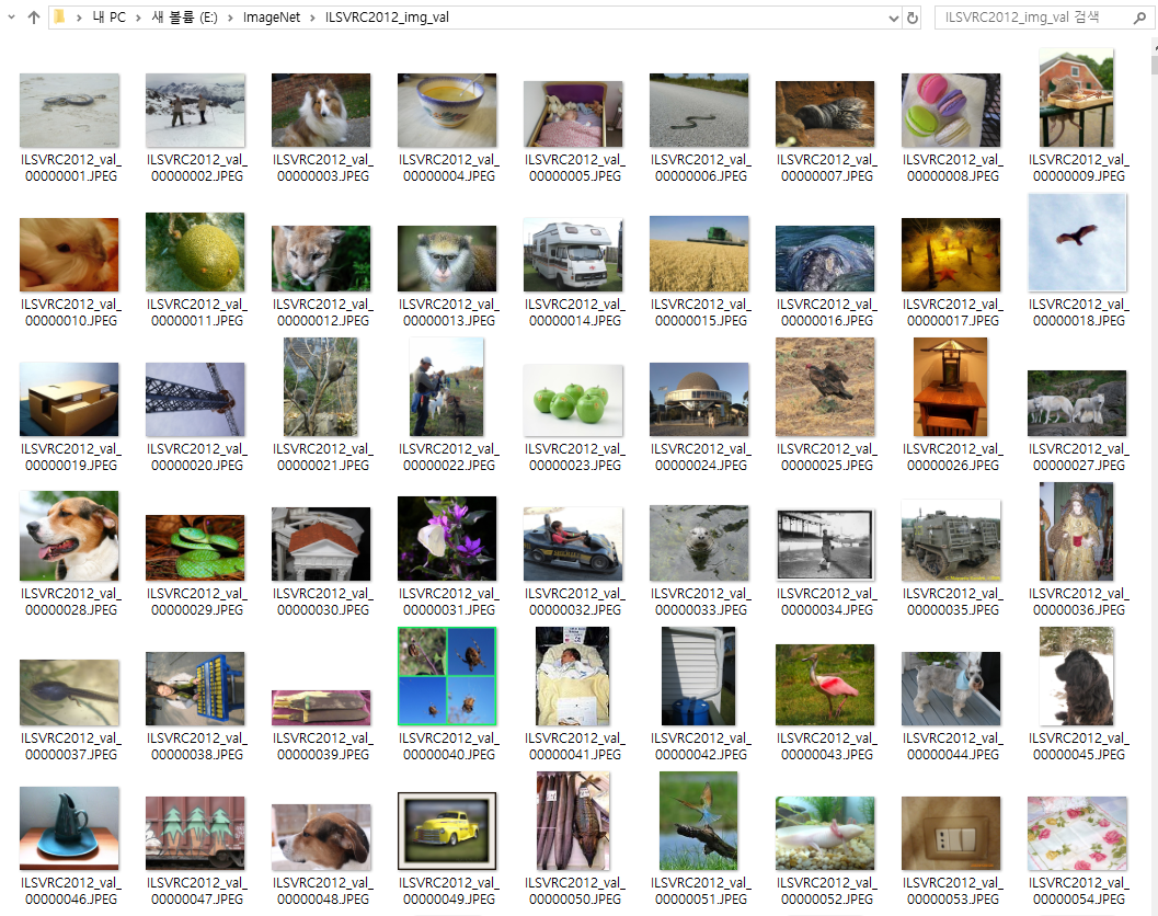 필자는 윈도우 환경에서 다운로드를 진행했다. 검증(validation) 데이터셋을 다운로드한 뒤에는 압축 파일을 확인해 보자. 총 50,000개의 데이터가 존재하는 것을 확인할 수 있다. 확인해 보면 단순히 이미지 파일만 존재하는 것을 알 수 있다. 따라서 약간의 전처리가 필요하다.