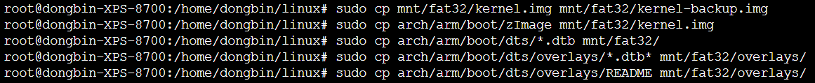 sudo cp arch/arm/boot/dts/overlays/*.dtb* mnt/fat32/overlays/