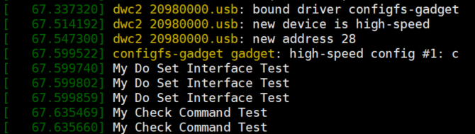 이제 SD 카드를 뽑은 뒤에 Raspberry Pi에 꽂아서 부팅합니다. 저는 부팅 이후에 Multi Gadget Driver를 사용하도록 하고, Mass Storage 기능을 활성화하도록 설정했습니다. 이후에 dmesg를 입력했을 때 다음과 같이 로그(log)가 찍혀 있는 것을 확인할 수 있었습니다. 다시 말해 정상적으로 커널 컴파일 및 업로드 완료 된 것입니다.