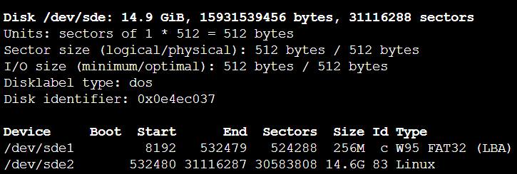 확인해보니 제 SD 카드는 sde라는 이름을 가지네요. 따라서 차례대로 FAT과 ext4 파티션을 각각 마운트합니다.