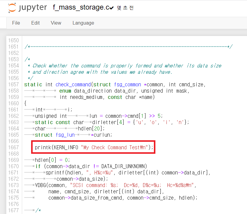 저는 여기에서 제가 만든 커널이 정상적으로 동작하는지 확인하기 위해 드라이버 코드를 아주 조금 바꾸어 보겠습니다. drivers/usb/gadget/function/f_mass_storage.c는 Mass Stoarge 기능(function)을 위한 소스코드 구현부입니다. 저는 다음과 같이 printk() 명령을 이용하여 간단한 로그를 남길 수 있도록 했습니다.