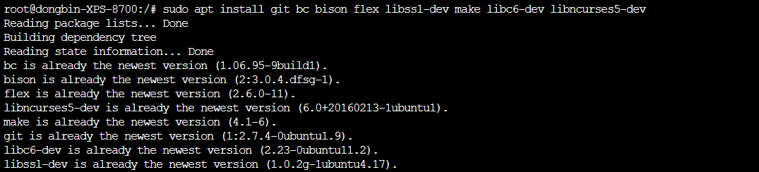 sudo apt install git bc bison flex libssl-dev make libc6-dev libncurses5-dev