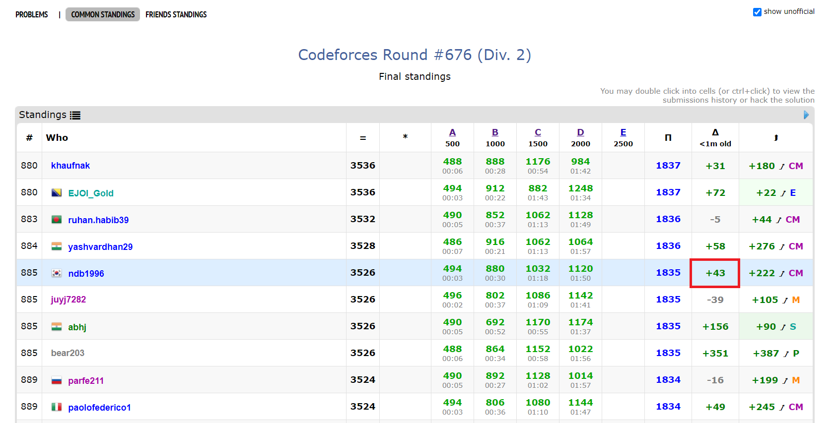 코드포스(Codeforces) 웹 사이트 내에서 점수 변화 및 퍼포먼스(performance) 정보도 함께 확인하고자 한다면, 캐럿(Carrot) 확장 프로그램을 사용할 수 있습니다. 캐럿을 사용하면 다음과 같이, 내가 오늘 치른 대회에서의 퍼포먼스(performance)와 점수 변화량(delta)을 확인할 수 있습니다.