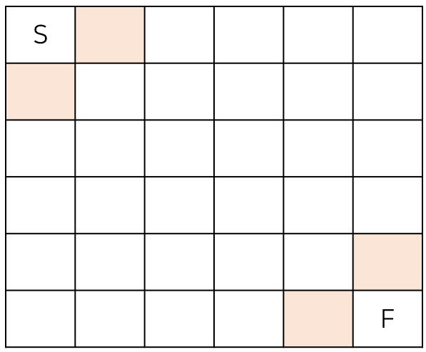이 문제는 S와 F의 위치에서 인접한 2칸씩만 확인하면 된다. 아래 그림에서 색칠한 부분이 이에 해당한다. 이 아이디어를 떠올릴 수 있으면 문제를 해결할 수 있다.