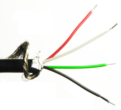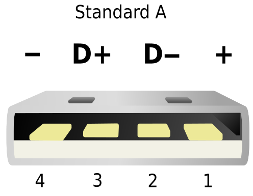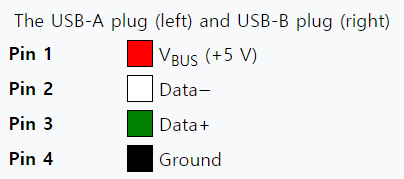 이처럼 소형 보드에서 USB 케이블을 두 개 연결하는 상황(혹은 외부 파워와 USB OTG를 이용하는 상황)에서 우리의 USB 보드를 고장 내지 않기 위한 가장 간단한 방법은 데이터 전송을 위한 USB 케이블에 대하여 빨간색 선(+5V power line)을 잘라서 사용하는 것입니다. 가장 일반적인 형태의 USB 마이크로 케이블은 Standard A를 따르는데요. 바로 다음과 같은 형태로 4개의 선을 이용합니다.