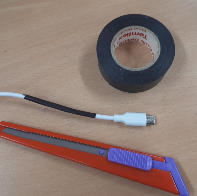 이후에 절연 테이프(이른바 검은 테이프)를 이용해 감싸면 됩니다. 절연 테이프란 이처럼 피복이 벗겨진 부분을 다시 감싸고자 할 때 사용하는 테이프를 말합니다. 결과적으로 USB 데이터 전송 목적(data-only) 케이블이 만들어졌습니다.
